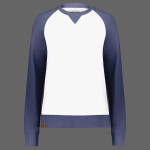 * 7.6 ounce 55% polyester/41% cotton/4% rayon, super soft fleece * Ladies' fit * Woven label * Exterior faux leather logo loop label * Contrast color V insert at center front neck * Raglan sleeves * Rib-knit collar, cuffs and bottom band